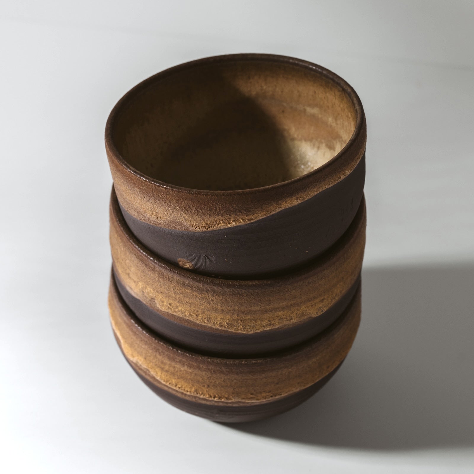 Tourner et façonner des objets avec ce grès noir est une sensation unique; la douceur de l'argile brute, le toucher de la pièce à la première cuisson, le contraste entre les parties recouvertes d'émail et celles laissées à l'état brut... L'émail satiné couleur bronze comporte des reflets ambrés, bleus ou verts, selon les cuissons. Cet émail, comme tous les autres que je conçois dans mon atelier, est sécuritaire pour l'usage alimentaire.