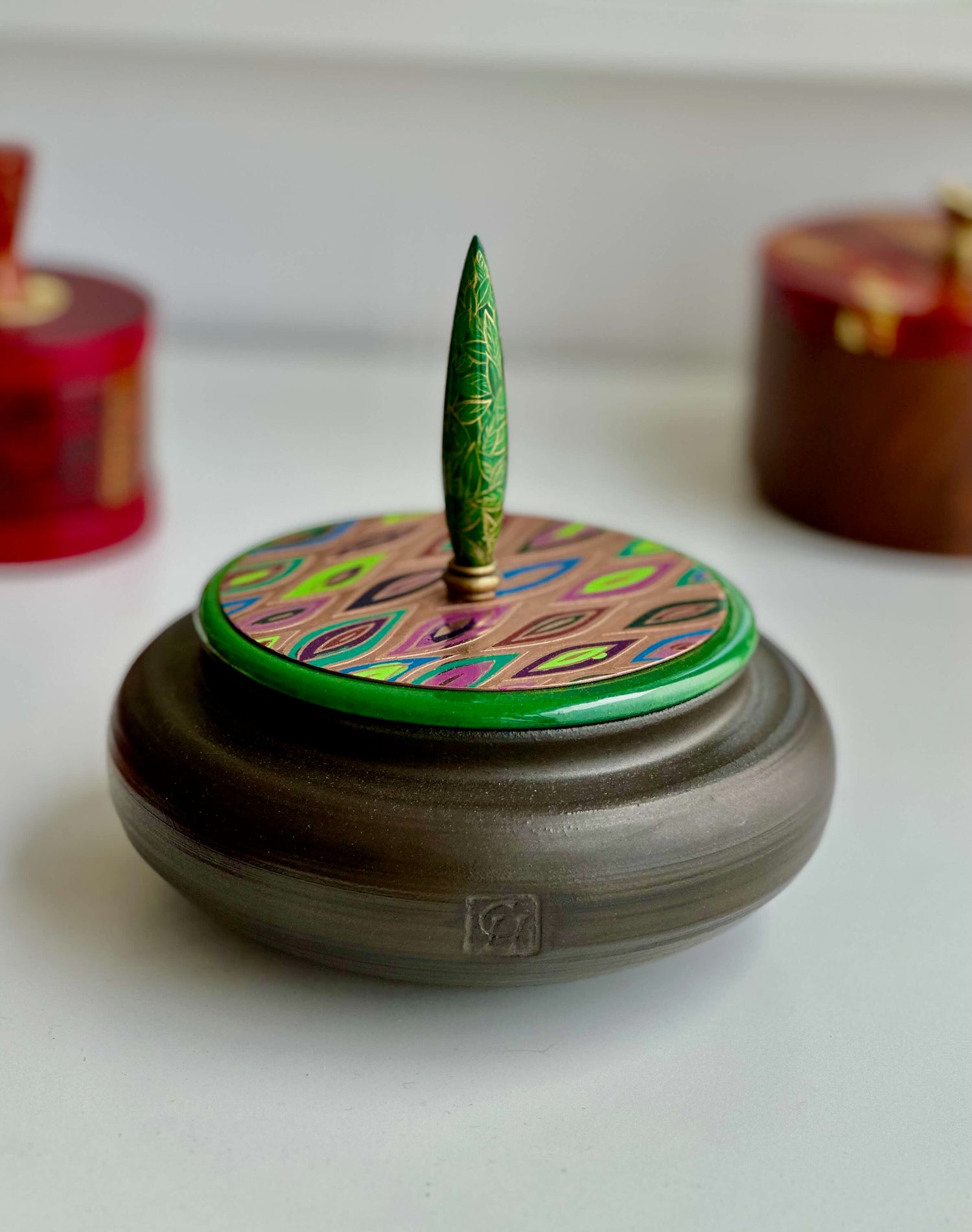 Two pieces in black stoneware with lacquered lids and caps from the “Les Précieuses” collection of boxes and bottles, presented at the Salon Résonance in November 2023 in Strasbourg, France.