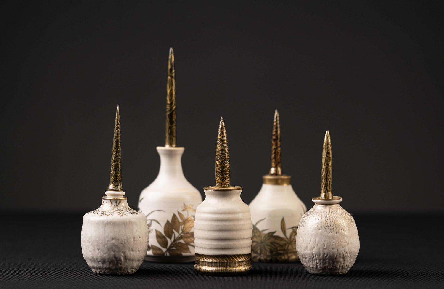 Pieces from the “Les Précieuses” bottle collection, presented at the Salon Résonance in November 2023 in Strasbourg, France.
