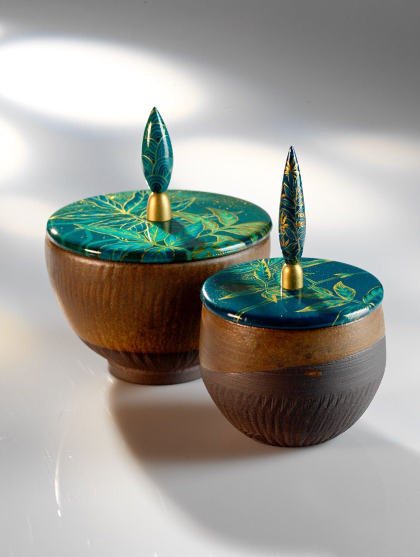 Nathalie: Décors et laque (pigments, ors, laque française) sur couvercles et bouchons en bois de hêtre.