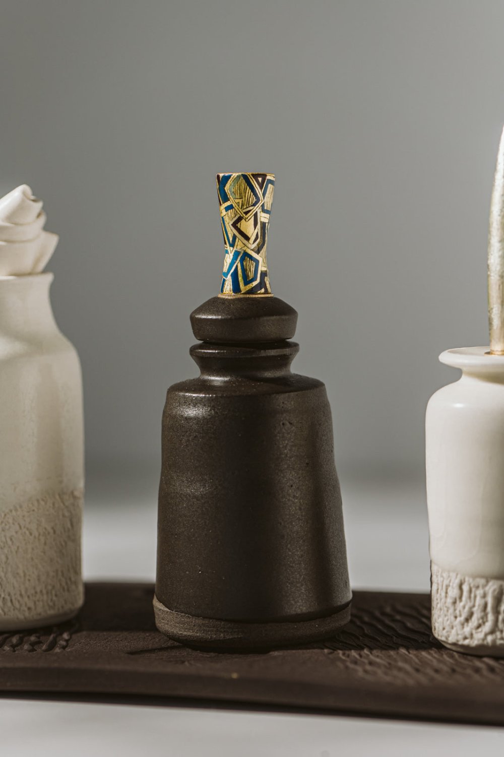 Pièces en grès noir avec couvercles et bouchons laqués de la collection de boites et flacons « Les Précieuses », présentées au Salon Résonance en novembre 2023 à Strasbourg, France.